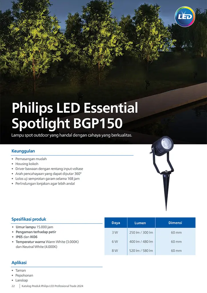 Pencahayaan yang efisien dan tahan lama adalah kebutuhan utama dalam berbagai sektor, mulai dari fasilitas umum, taman kota, jalan lingkungan, hingga area komersial. Salah satu produk unggulan dari Philips yang dirancang khusus untuk memenuhi kebutuhan tersebut adalah Lampu Philips LED Spotlight BGP150. Produk ini menggabungkan teknologi pencahayaan modern, desain tahan cuaca, serta efisiensi energi yang tinggi, menjadikannya pilihan terbaik untuk aplikasi pencahayaan luar ruangan.