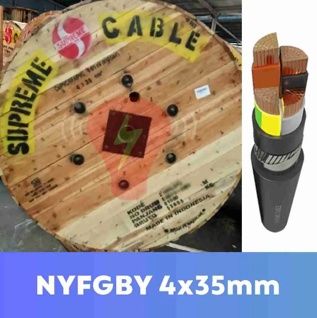 Kabel NYFGBY 4x35mm Supreme atau dikenal juga dengan kabel NYYGBY merupakan jenis kabel listrik yang dirancang khusus untuk instalasi bawah tanah, dalam ruangan tertutup, maupun lingkungan industri berat. Kabel ini tergolong kabel armoured karena memiliki lapisan pelindung tambahan berupa baja galvanis (steel tape armour) yang berfungsi untuk memberikan perlindungan ekstra terhadap gangguan mekanis, tekanan, maupun gigitan hewan pengerat.