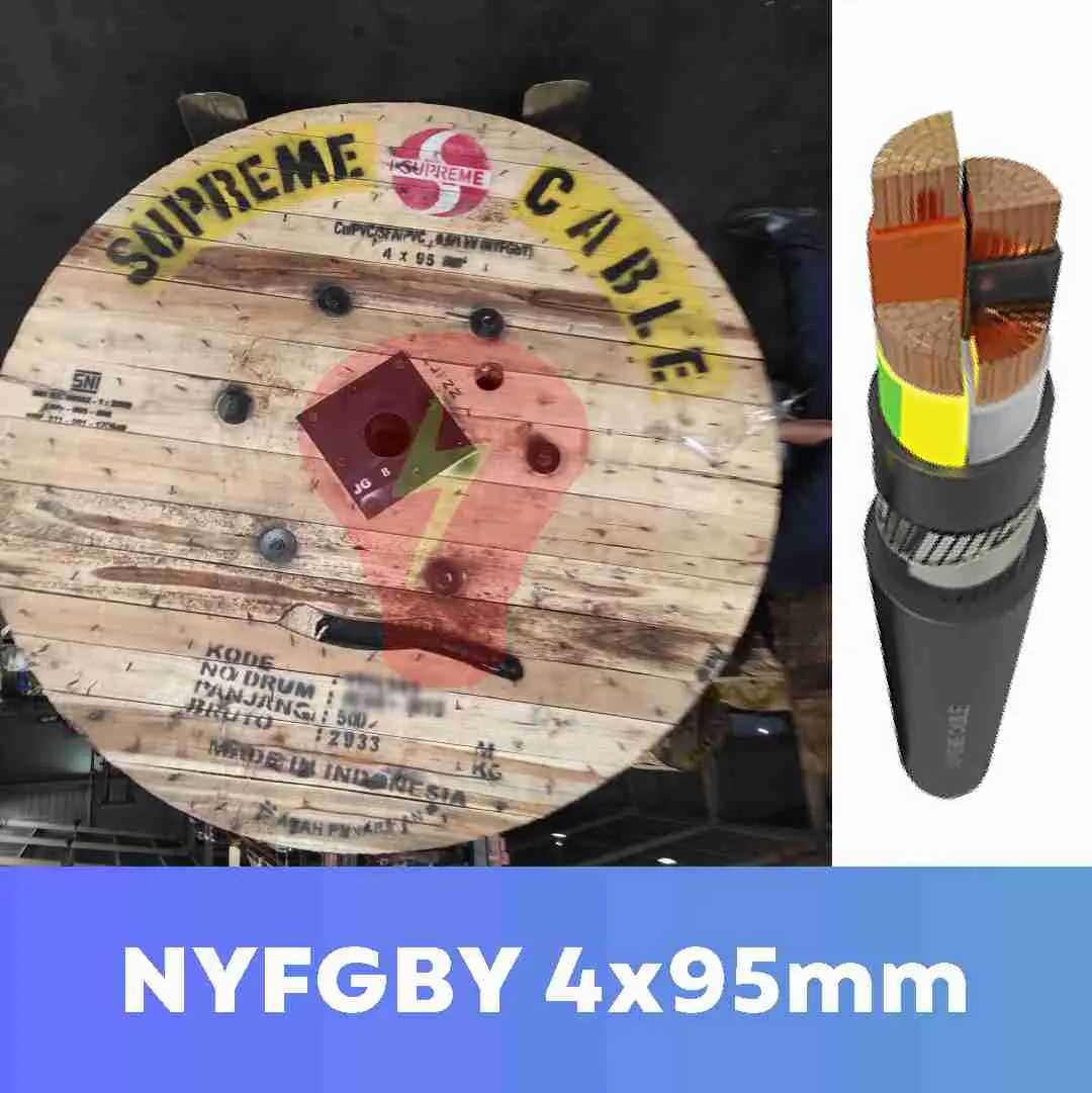 Kabel NYFGBY 4x95mm Supreme atau dikenal juga dengan kabel NYYGBY merupakan jenis kabel listrik yang dirancang khusus untuk instalasi bawah tanah, dalam ruangan tertutup, maupun lingkungan industri berat. Kabel ini tergolong kabel armoured karena memiliki lapisan pelindung tambahan berupa baja galvanis (steel tape armour) yang berfungsi untuk memberikan perlindungan ekstra terhadap gangguan mekanis, tekanan, maupun gigitan hewan pengerat.