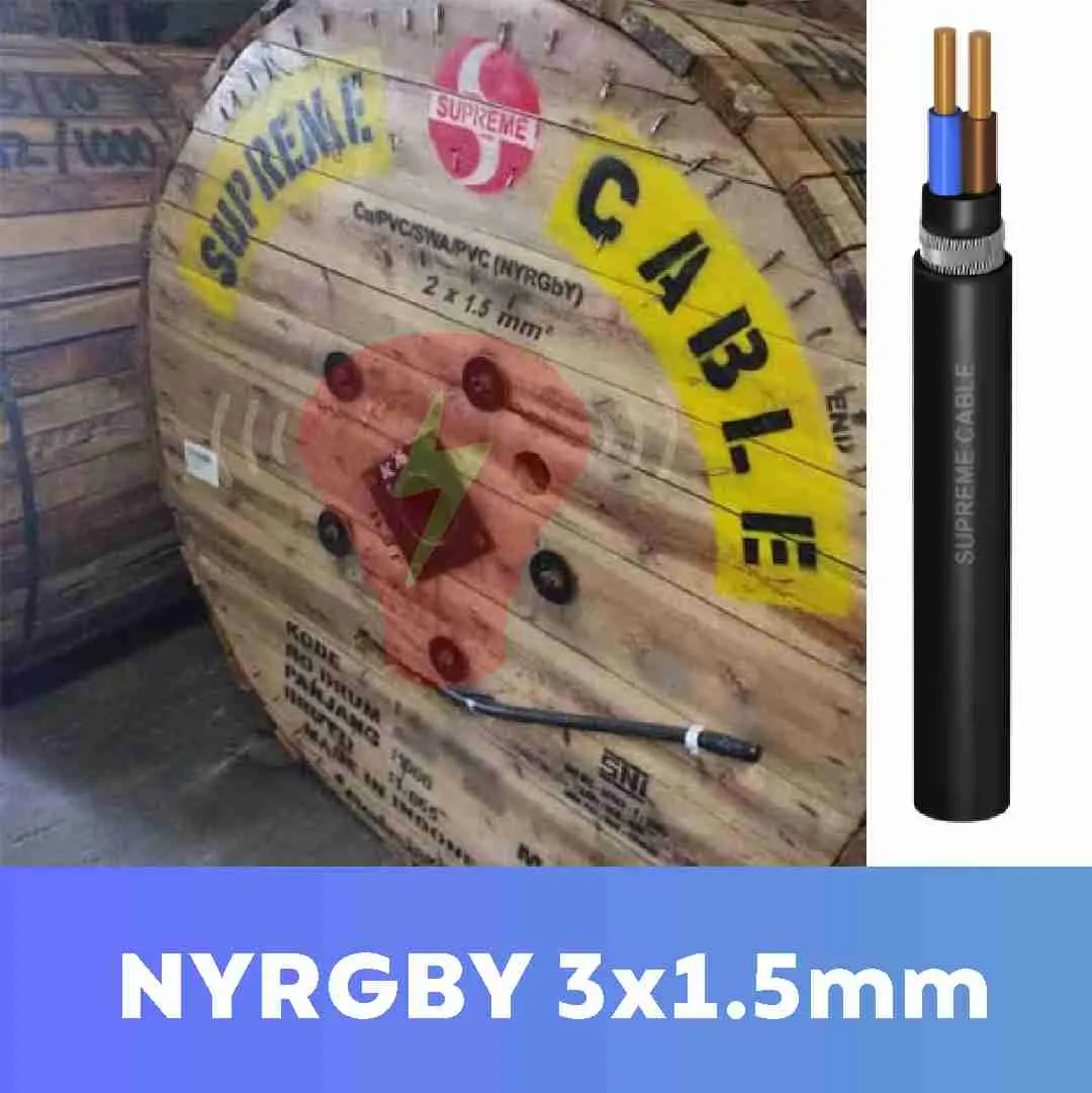 Kabel NYRGBY 3×1.5mm Supreme atau dikenal juga dengan kabel NYYGBY merupakan jenis kabel listrik yang dirancang khusus untuk instalasi bawah tanah, dalam ruangan tertutup, maupun lingkungan industri berat. Kabel ini tergolong kabel armoured karena memiliki lapisan pelindung tambahan berupa baja galvanis (steel tape armour) yang berfungsi untuk memberikan perlindungan ekstra terhadap gangguan mekanis, tekanan, maupun gigitan hewan pengerat.